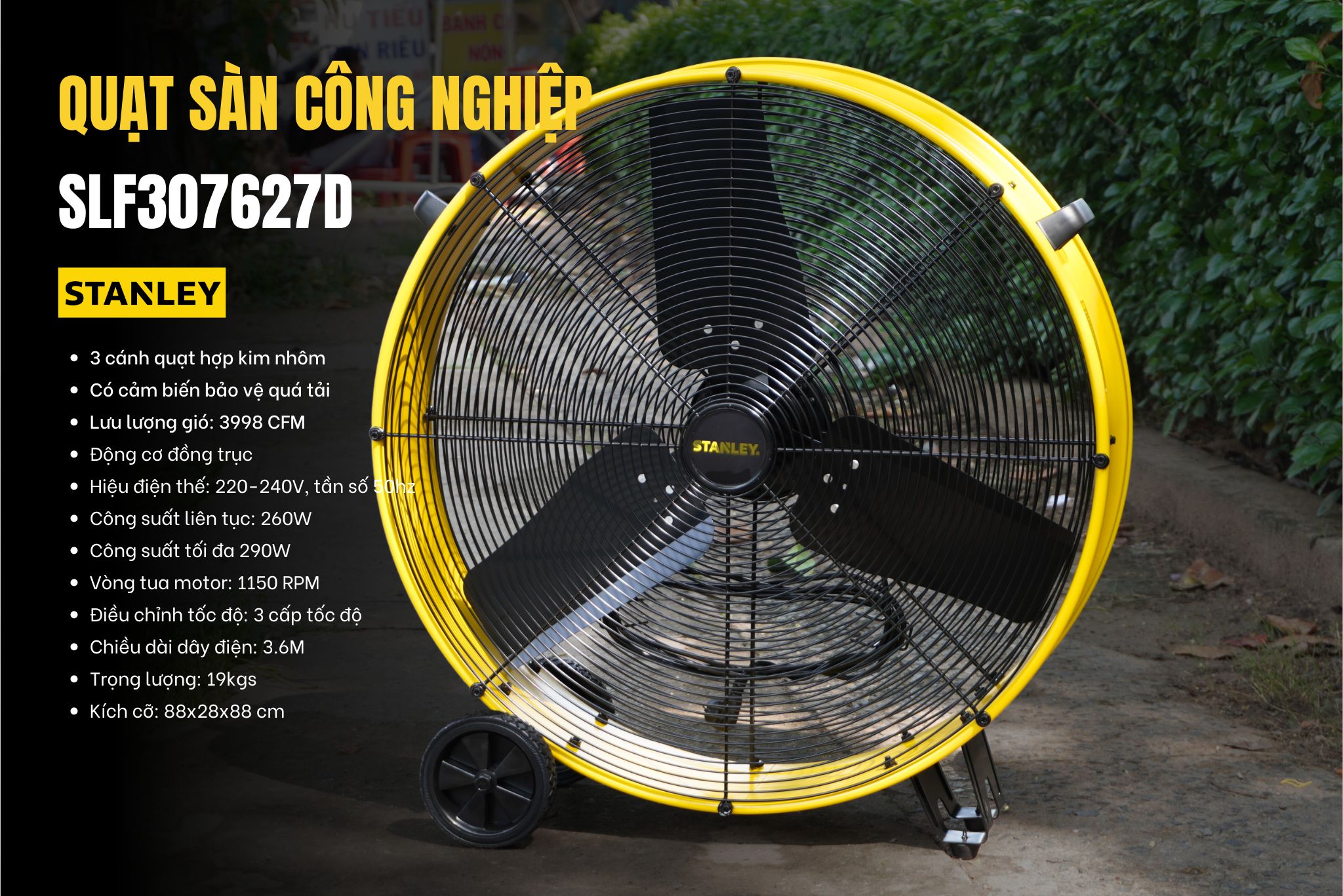 Với lưu lượng gió lên đến 3998 CFM, quạt Stanley SLF307627D đem lại không gian mát mẻ và thoải mái cho môi trường làm việc hay sản xuất.